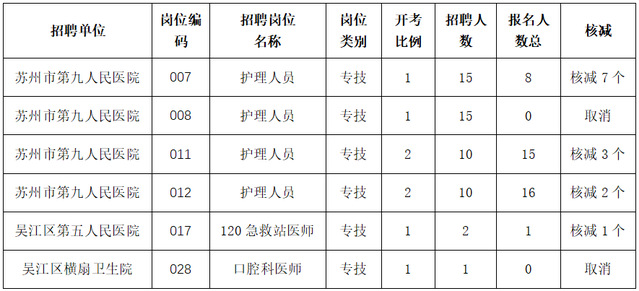 2021年苏州市吴江区北部健康医疗集团公开招聘合同制专业技术人员自2021年6月17日至2021年6月18日报名结束,共有6个岗位报名人数不足开考比例,根据规定,核减招聘计划,并公布如下: