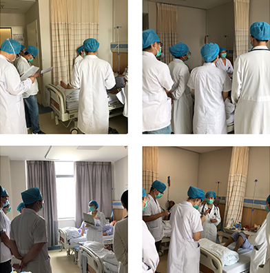 随后是教学查房环节,由焦雪花副主任医师、沈晓华副主任医师、王娟副主任中医师、殷雪燕副主任医师分别带领5-6名学员分4组进行。带教老师们专业素养高、理论基础扎实、临床经验丰富,从询问患者病史、查体起再涉及糖尿病的诊断标准、分型、鉴别诊断、并发症诊疗等方面由浅入深详细讲解,学员们听得全神贯注、不时记录知识点,并与老师互动交流。沈晓华主任为大家做了教学查房总结,详细讲解了此次教学查房目的、重点难点等。