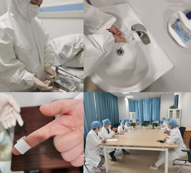 模拟场景为护士在留观病室为患者输液时发生针刺伤,先就近脱去手套,从近心端向远心端轻柔挤压受伤手指挤出受伤部位血液,使用流动水进行冲洗,用75%乙醇或碘伏消毒并包扎刺伤部位后戴上清洁手套,并汇报新冠防控办、感染管理科。防控办、感染管理科接到报告后组织医院专家评估暴露风险。经过专家组讨论,评估此次暴露风险较低,故不需要进行隔离观察,医务人员按血液体液暴露进行常规处理。