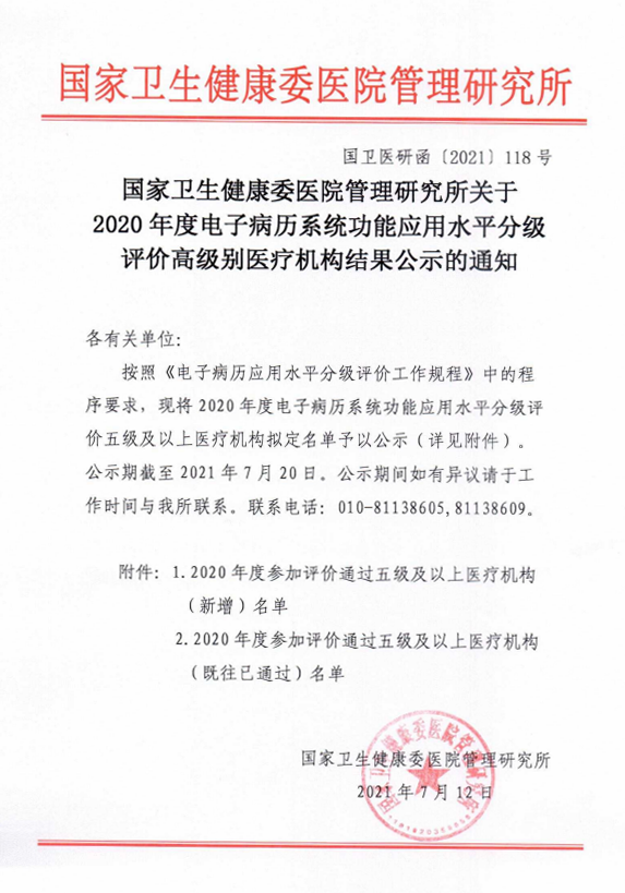 2020年7月,探花直播 正式申报电子病历应用功能水平分级评价5级,经过了数据上报、系统初评、省级答辩、省级初审、国家盲审等评审环节后,由国家卫生健康委医院管理研究所组织的电子病历应用评审专家组,于2021年3月17日对医院进行了线上远程评审。