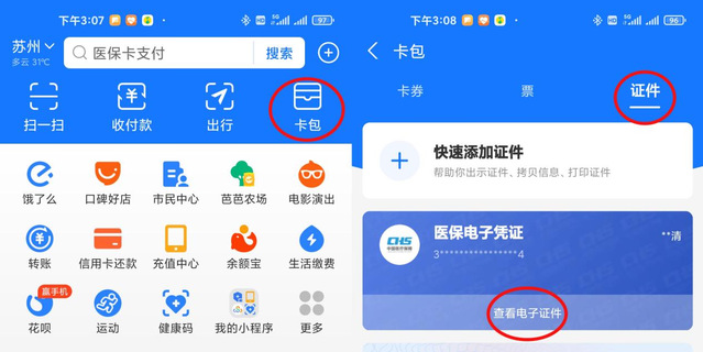 打开“支付宝”,选择右上角“卡包”,进入“卡包”后选择“证件”,点击“医保电子凭证”,即显示二维码,可直接用于扫码结算。