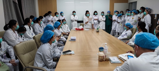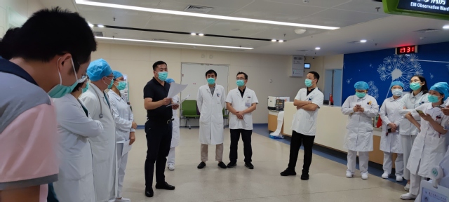 医务处李军副主任首先介绍了演练目的及演练流程。演练开始后,EICU7名医务人员按“药物过敏性休克演练脚本”进行实战演练,其余人员现场观摩,演练总时间约15分钟。
