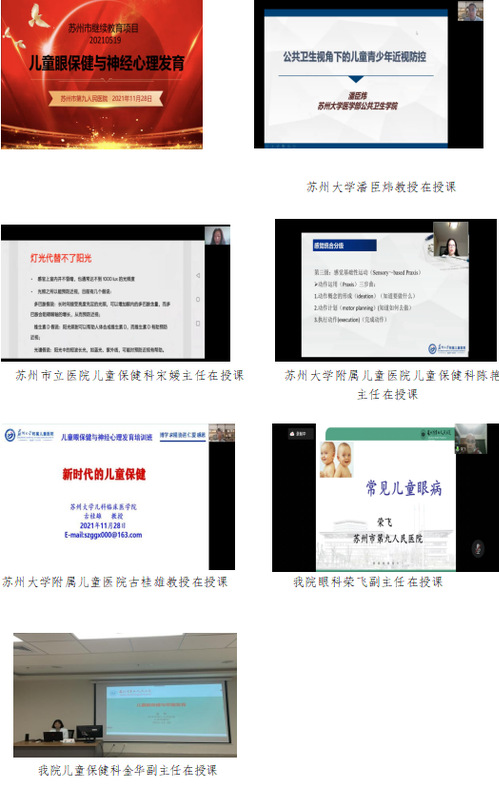 本次学习班有幸邀请到了吴江区妇幼保健所张永刚所长致开幕词,另特邀请了苏州大学潘臣炜教授、苏州市立医院儿童保健科宋媛主任、苏州大学附属儿童医院儿童保健科陈艳主任、苏州大学附属儿童医院古桂雄教授及探花直播 眼科荣飞主任、儿童保健科金华主任,围绕儿童眼保健与神经心理发育,分别就公共卫生视角下的儿童青少年近视防控、近视0-6岁儿童早期预防证据和做法、儿童感觉统合发展、新时代的儿童保健、常见儿童眼病、儿童眼保健与早期发育进行了深入浅出的讲解。专家指出:一、先天性眼睛问题早期筛查很重要,儿童保健科体检能及早发现问题;二、婴幼儿时期不宜过早过度使用眼睛,好的“读书习惯”一定要在儿童眼睛发育完善的时候养成;三、儿童使用电子产品不仅要限制时间,还要限制使用环境,需在光线良好的环境下,黑暗中强光对眼睛的伤害是不可逆的;四、儿童要确保每日户外活动时间,不仅仅是运动会带来益处,自然光对眼睛的益处也是灯光望尘莫及的。