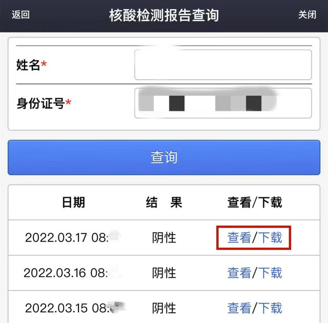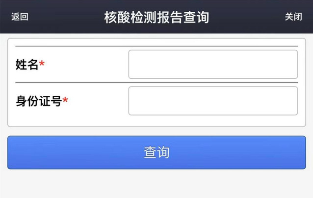 点击【核酸报告】后,输入【姓名】和【身份证号】,即可查询。