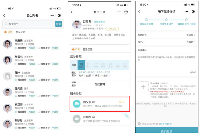 4.选择科室及医生后点击【图文复诊】,患者需填写相关病历情况。(挂号费用根据医生职称不同,费用也不同。)