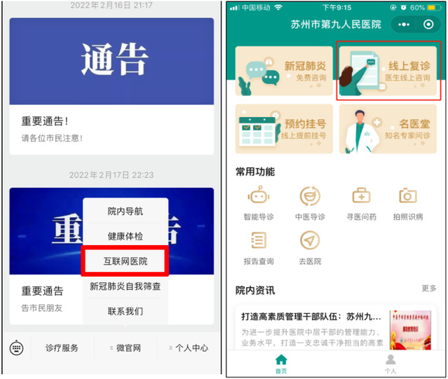 2.已在江苏健康通注册并完成实名认证的用户,可直接使用江苏健康通账号密码从我院公众号进入互联网医院线上复诊。