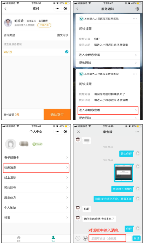 5.问诊服务购买后,患者将等待医生发起会话,医生发送消息给患者时,在服务通知中患者将收到消息提醒,点击【进入小程序查看】,点击【往来消息】进入问诊。