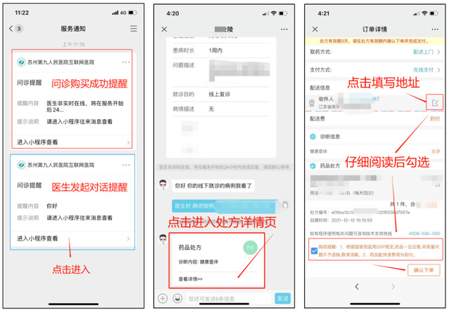 3、医生接诊后,点击问诊提醒进入问诊页面,回复医生问题,如医生问诊中开具了处方,在药师审方通过后,可看到问诊页面有处方框出现,点击处方框填写药品配送地址,提交后支付药品费用,等待药品配送。注意:快递费用为到付。