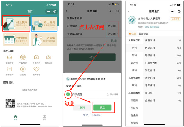 1、点击“线上复诊”(有就诊记录,复诊购药)或“在线咨询”(无就诊记录,无需购药),如跳出“去订阅”页面,请勿忽略跳过,勾选问诊提醒后,点击确定。