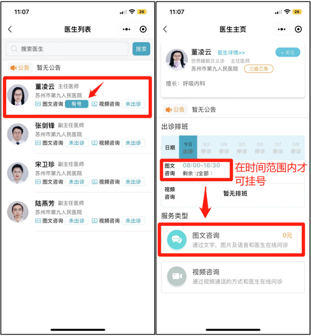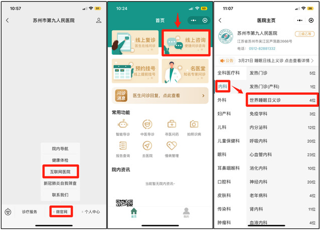 微信搜索“探花直播 ”公众号关注并打开选择“微官网”点击“互联网医院”选择“线上咨询”选择内科---世界睡眠日义诊-- 医生(显示有号源)--图文咨询--填写信息提交问诊--等待医生接诊。