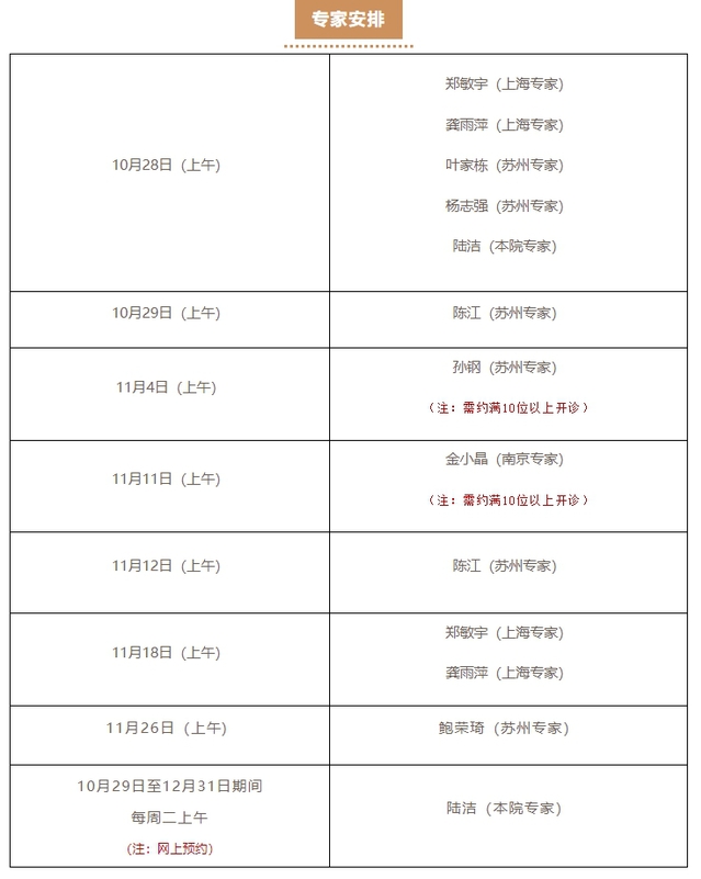 10月28日在门诊四楼特需门诊10月29日、11月4日、11月11日、11月12日、11月18日、11月26日在门诊四楼中医科门诊6、7号诊室