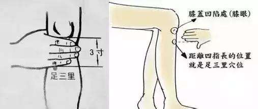 按揉足三里:(取穴除大拇指外的其余四指并排放于膝眼下,无名指再外开一横指就是足三里穴):双手拇指或食、中指置于足三里穴,稍用力按揉使局部有酸胀感。有强壮作用,可健运脾胃。