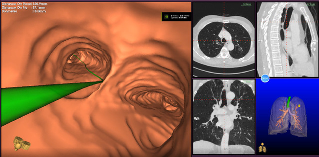 近年来,随着计算机断层扫描肺部筛查的普及,筛查期间发现了很多的外周型肺结节,这些外周型肺结节的性质单从影像学上无法分辨,明确诊断需依靠病理检查。但经气管镜穿刺或活检很多时候无法到达外周型肺结节的位置,可能需要进行并发咯血、气胸、血胸等风险较高的CT引导下经皮肺穿刺才能取到病理,且该项检查患者辐射暴露的风险亦增加。而磁导航支气管镜检查则突破了传统支气管镜检查的应用瓶颈,该项检查是一种将磁导航系统、支气管镜检查以及CT三维重建技术相结合的新技术:在患者CT影像的基础上,通过建立肺部“GPS导航”地图,利用体外磁场定位板来进行实时引导定位电磁导航支气管镜操作,使得定位导线和鞘管快速精准地到达肺部的每一个角落,可以精准定位肺外周靶病灶、开展活检及治疗。