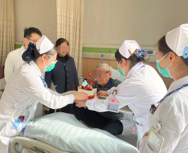 术后老人恢复健康 迎来医院送上的寿星蛋糕