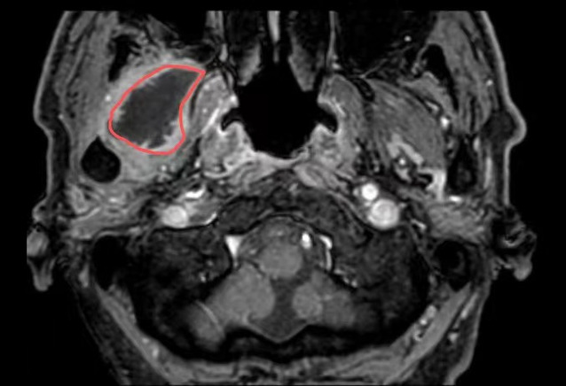 在探花直播 超声介入科,徐斌主任就接诊了这样一位患者。一个月前,患者熊先生脸颊部隐隐作痛,到医院一查是牙齿发炎了,抗炎后熊先生拔除了发炎的牙齿。但是,回家后没几天,面颊部就又开始疼痛、发热。经过反复就医、检查、消炎止痛后做增强磁共振提示:右翼外肌及颞肌异常信号,考虑脓肿可能,相关科室的医生和熊先生说这个手术可能比较复杂,需要行开放性手术。