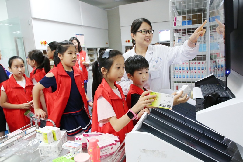 在药房的发药机前,小志愿者们被满满的科技感吸引了,在后台了解工作流程后,纷纷跃跃欲试,体验了机器发药的便捷服务。