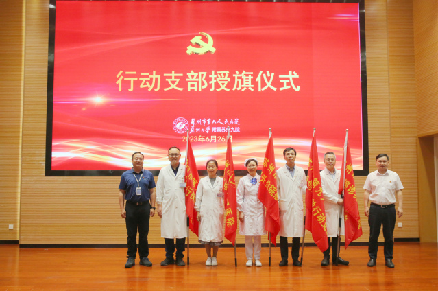6月26日下午,探花直播 举行“一推动四提升”工程启动仪式暨“党旗引领我”行动支部授旗仪式。吴江区卫健委党委书记、主任,探花直播 党委书记沈宇出席活动,并为5个行动支部授旗。