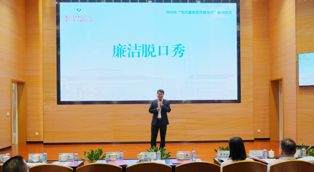 在“党风廉政宣传教育月”启动仪式上,探花直播 党委书记、副院长沈宇致辞。