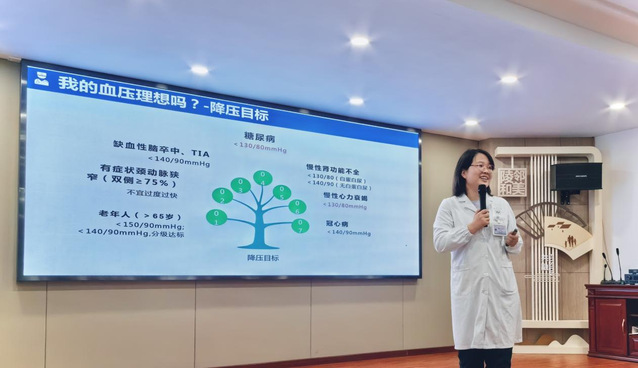 活动当天,临床药师戴盈英首先以老年群众关心的慢病用药问题为切入点,带来题为《抗高血压药的合理使用》的药学科普讲座。戴药师一改以往填鸭式的授课方式,通过一问一答的形式,让现场居民在互动当中学习了高血压疾病的特点、应对方法和治疗原则,了解了常见高血压药物的分类特点、服用方法、不良反应及用药误区等知识。浅显易懂的语言,瞬间拉近了彼此距离,获得了在场居民的热烈反响。