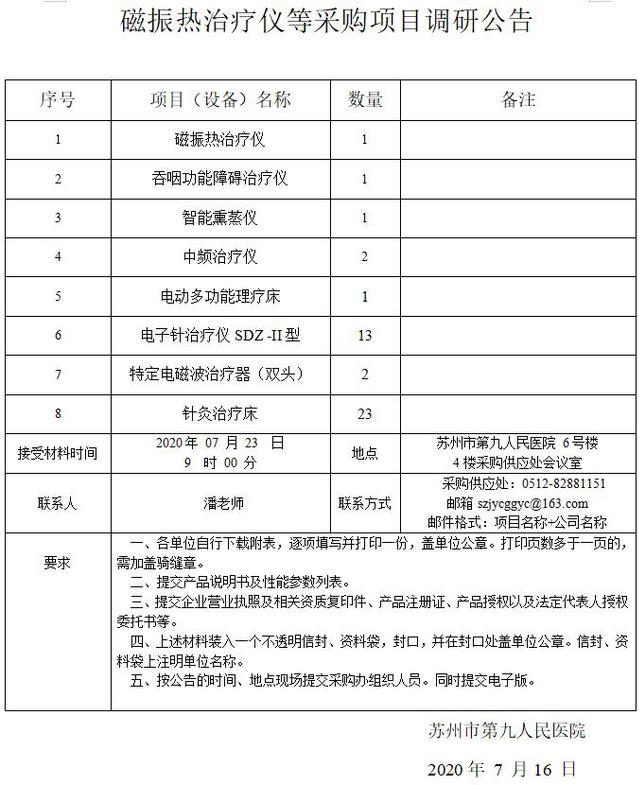 磁振热治疗仪等采购项目调研公告