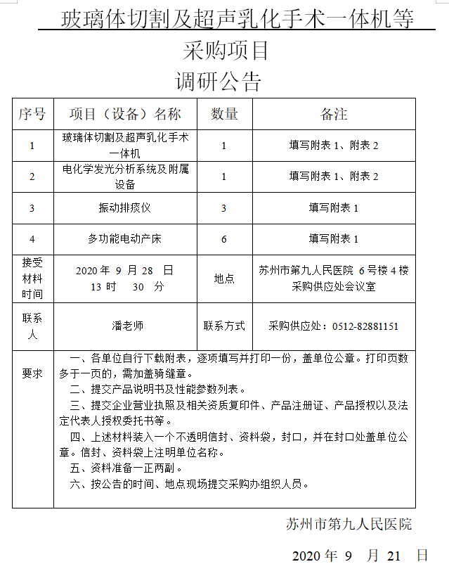 玻璃体切割及超声乳化手术一体机等采购项目调研公告