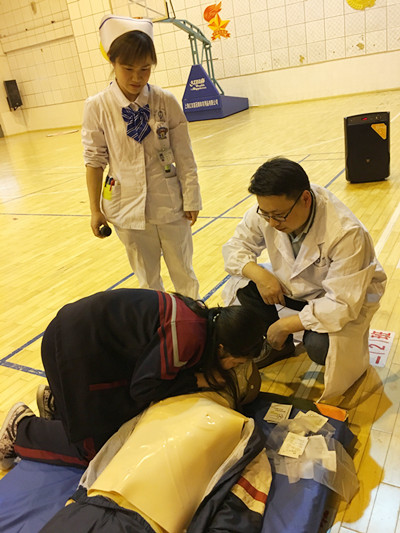 4月26日,我院“急救危重症”团队一行8人在医务处副主任周兴根、护理部副主任刘永琴的带队下,来到吴江区实验初级中学开展急救知识培训。学校安排了宽敞明亮的体育场作为培训场地,我们将心肺复苏模型等讲课设备统一布置完毕。两位专科护士在人体模型上示范急救的分解动作,另一位专科护士进行同步讲解,同学们听得认真,看得仔细,老师们示范到位。心肺复苏术如今已被大众所熟知,但要做到正确有效的操作却并不容易,除了手法的到位,还有频率的把控,动作失之毫厘,急救效果却会差之千里。