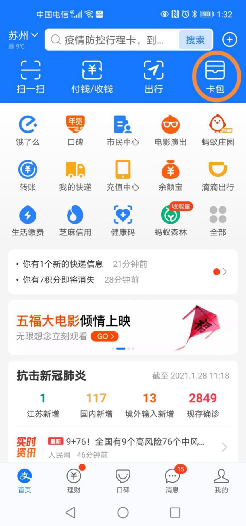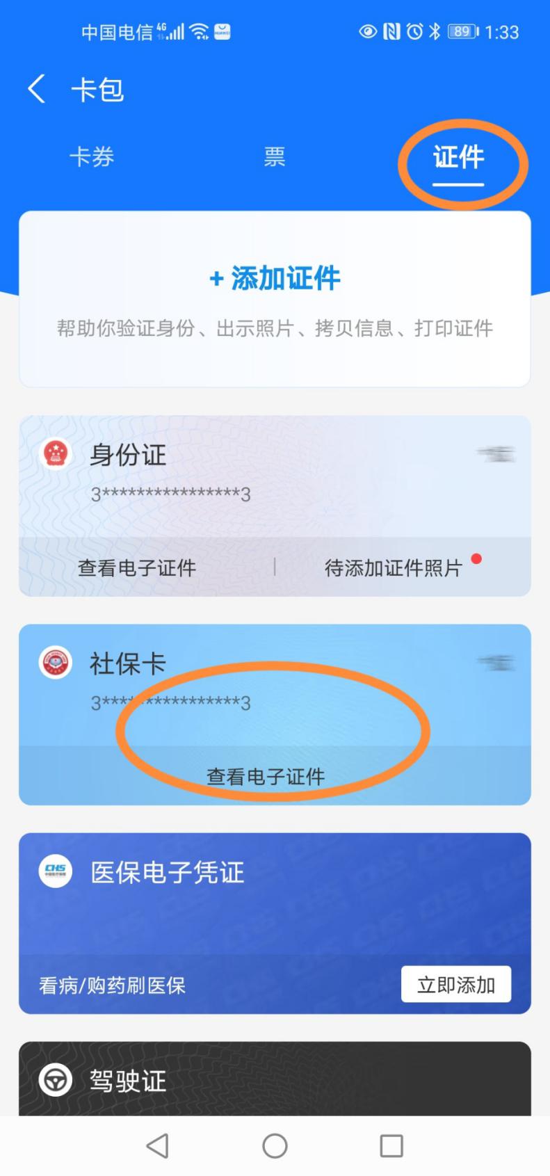 2、在卡包里选择“证件”里的“社保卡”。(首次使用电子社保卡需要点击立即添加社保卡后实名认证)
