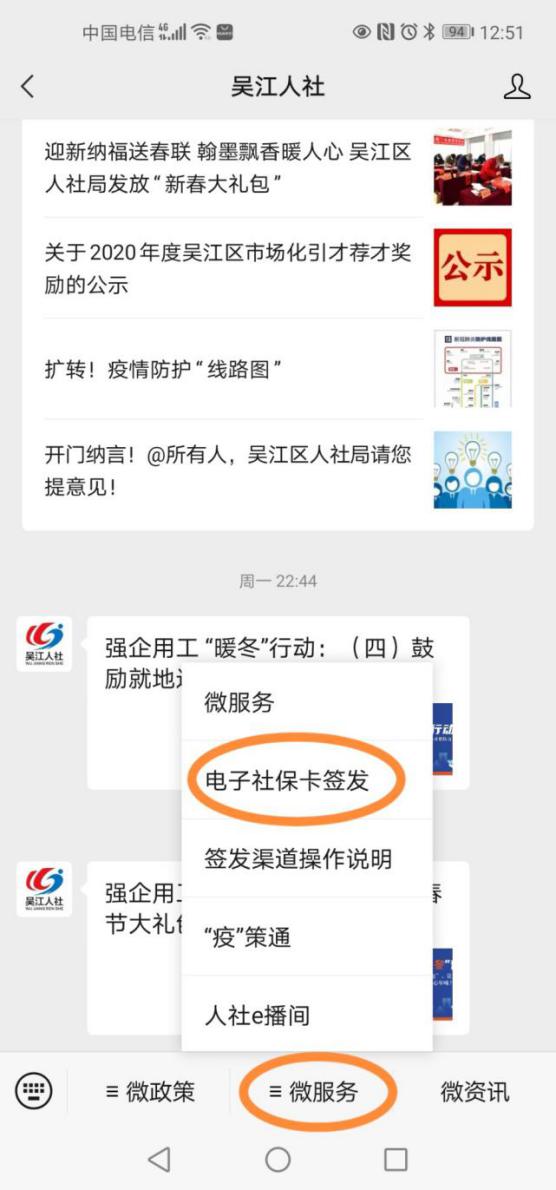 1、微信扫码关注“吴江人社”公众号,选择“微服务”里的“电子社保卡签发”。(首次使用需要人脸实名认证)