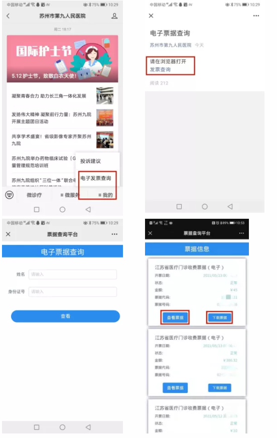 打开微信公众号“探花直播 ”,在右下方“我的”中点击“电子发票查询”,选择浏览器打开电子发票,填写患者的姓名及身份证号码,即可查看票据和下载票据。