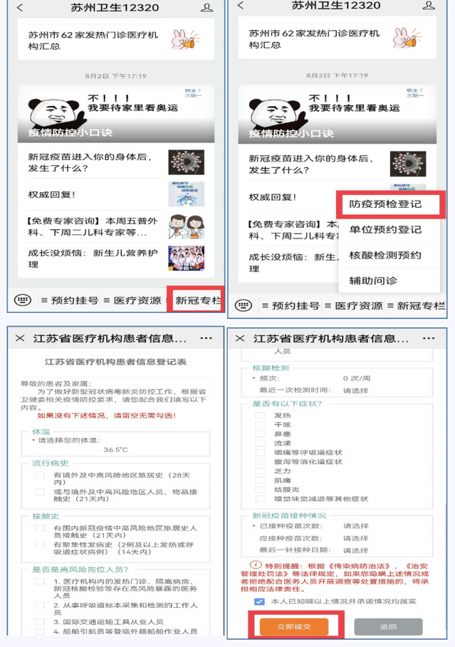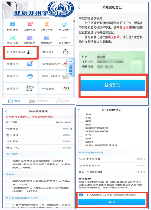 1.市民可在就诊当日通过健康苏州掌上行APP、苏州卫生12320 公众号探花直播菜单“新冠专栏”,点击“防疫预检登记”。选择就诊人后,登记防疫预检信息。也可通过苏州卫生 12320公众号探花直播菜单“预约挂号”栏选择“我要预约挂号”,在 弹出的提示框中点击“立即登记”,选择就诊人后,登记防疫预检信息。