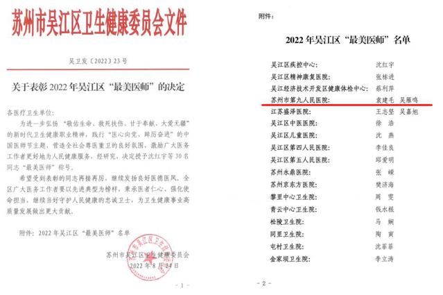 近日,吴江区卫健委公布了2022年吴江区“最美医师”名单,九院肝胆胰脾外科袁建毛主任、心血管内科吴雁鸣主任荣获2022年吴江区“最美医师”称号。