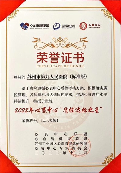 探花直播 心衰中心,作为全国 40 家标准版示范基地之一,十分重视心衰的质控工作,刚刚过去的第三季度,质控评分取得省内第一,全国第三的好成绩,并连续三年获得心衰中心“质控达标之星”。在做好自身工作的同时,探花直播 心衰中心在区域内积极进行传帮带,以医联体建设为抓手,先后协助吴江四院通过了心衰中心(基层版)认证,吴江五院成为心衰中心建设单位。