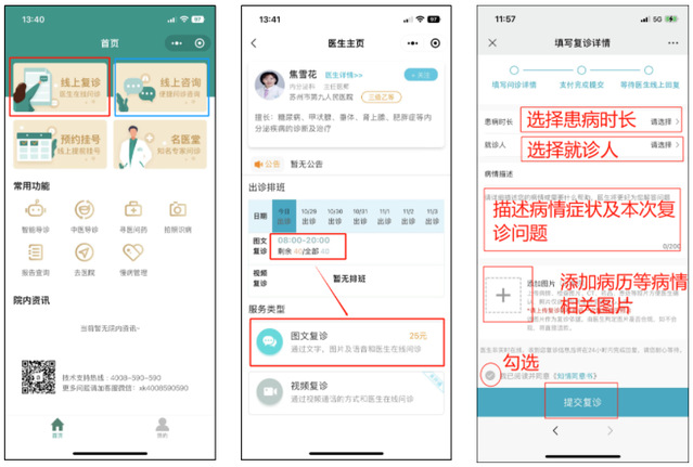 点击“线上复诊”(有就诊记录,复诊购药)或“在线咨询”(无就诊记录,无需购药),选择问诊科室和医生,点击进入医生主页,选择有号源的问诊服务(图文复诊),填写问诊详情,提交后支付问诊费用。