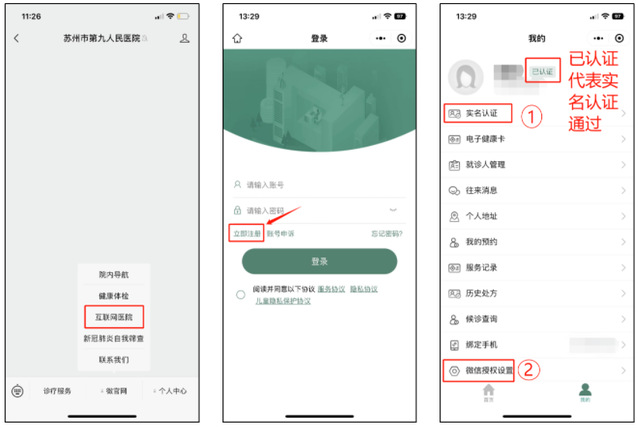 搜“探花直播 ”公众号-“微官网”中的“互联网医院”,进行“立即注册”,填写个人信息后,点击“实名认证”,完成实名认证后,点击微信授权设置。