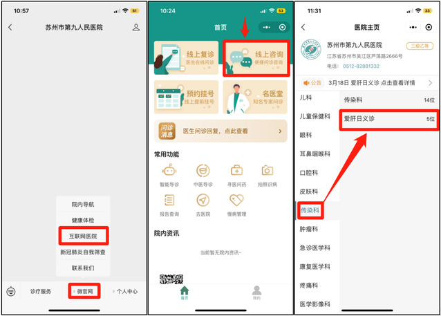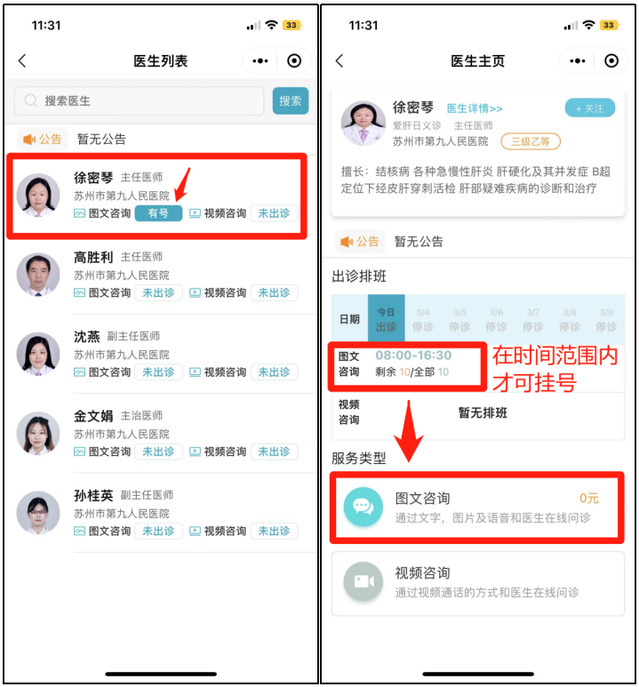 微信搜索“探花直播 ”公众号关注并打开选择“微官网”点击“互联网医院”选择“线上咨询”选择传染科---爱肝日义诊-- 医生(显示有号源)--图文咨询--填写信息提交问诊--等待医生接诊。