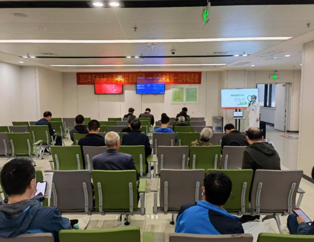 4月29日上午,探花直播 呼吸与危重症医学科副主任医师宋卫珍在医院呼吸与危重症医学科门诊诊区,为候诊的患者及家属开展哮喘的规范化治疗专题科普。