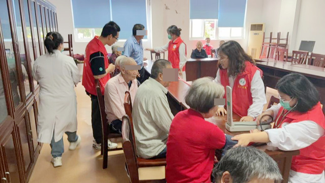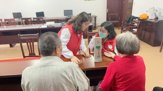 医护人员为老年人免费测血压,提供健康咨询服务,指导如何做好常见慢性疾病的日常健康管理。