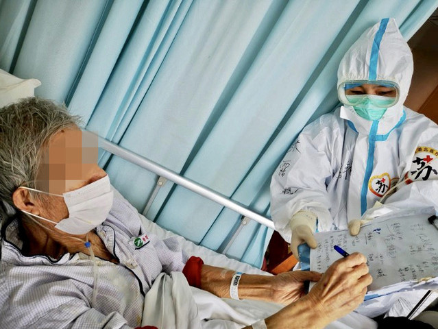 印象*深的是我们有一位老爷爷,刚进病区时是颤颤巍巍搀扶过来的,有脑梗史,不能说话,护理他时还是有一定难度的。好在后来听说他是大学生,听力还是很好的,于是我们在床头给他准备了一个写字板,每次进去都是通过写字进行交流,给他喂饭及服药时,也要格外小心,准备合适的温度,半流质要一小勺一小勺慢慢喂他,生怕他呛到。