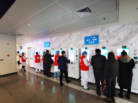 在自助机区域,患者仅需几秒钟就完成了自助取号,井然有序,无需等待就可进行下一步就诊。而在保留的挂号窗口前,因未提前预约而来就诊的患者则排起了“长龙”,医务人员和志愿者们边做着详细的解释工作,边维持着患者间保持一米的间隔距离,还有志愿者在给患者演示如何在手机上进行网上预约。