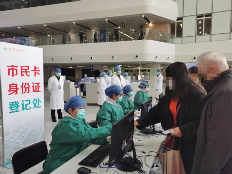 8:00左右,就诊高峰逐渐到来,在保安人员的现场维持下,患者有序进入门诊,快速完成实名制刷卡和体温检测后入院。随即,就有穿着红马甲的志愿者上前来询问有无提前预约,有预约的患者被引导到自助机前取号,而未提前预约的患者,则不得不到有限的人工挂号窗口排队等候。大部分患者都已经知晓九院推行预约诊疗模式,少数患者则表示没有关注新闻,但也表示理解。